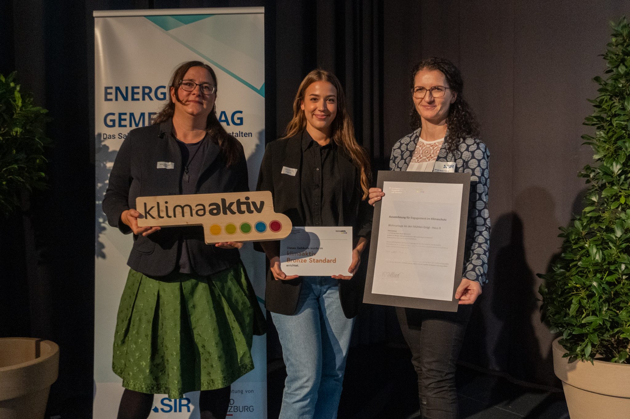 Wie kann Energieversorgung in Gemeinden nachhaltig geplant werden? Welche Rolle spielen Energiegemeinschaften und Kleinwasserkraft? Und auf welche (digitalen) Tools können Gemeinden zurückgreifen? Die Expert:innen des SIR und ihre Partner teilten ihr Wissen praxisnah, verständlich und gaben Tipps, die Gemeinden sofort umsetzen können. Vorgestellt wurde unter anderem der EnergieKompass Salzburg, der zeigt, wie Gemeinden ihren Energiebedarf nachhaltig planen können. Es folgte eine Demonstration, wie durch Energiegemeinschaften Kosten gespart werden können und im Anschluss wurden die Auswirkungen der EED III auf Gemeinden aufgezeigt. Außerdem wurden Kleinwasserkraftwerke als Chance für Gemeinden vorgestellt und das klimaaktiv-Gebäude-Programm mit Best-Practice-Beispielen und Auszeichnungen präsentiert. Acht Gebäude in Salzburg wurden heuer mit dem klimaaktiv-Zertifikat geehrt: Zwei Wohnobjekte in der Neue-Heimat-Straße Grödig wurden mit der klimaaktiv Plakette in Gold ausgezeichnet. Silber ging an das Bürogebäude der GeoSphere Austria sowie in Form einer Doppelauszeichnung an die Sanierung und Erweiterung des BORG Radstadt. Die Auszeichnung in Bronze erhielten schließlich noch das sanierte Mehrfamilienhaus Köppl, das Haus B des Wohnprojekts „An den Mühlen“ in Gnigl sowie die Neue Mitte Lehen in Form einer Nachdeklaration.